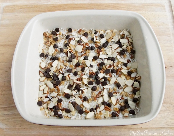 - Sprinkle the shredded coconut over the layer of condensed milk, then top with chocolate chips and nuts.