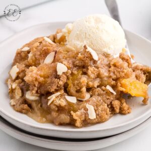 • Sliced peaches in heavy syrup: the syrup from the peaches adds enough liquid to make this recipe work so make sure not to drain the peaches. Pie filling or peaches in juice would also work in this recipe.