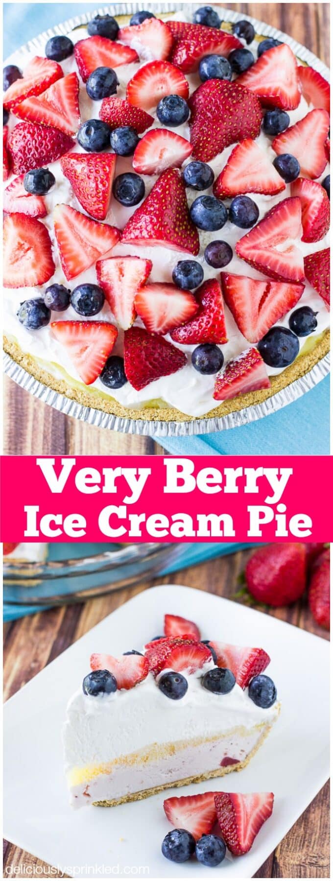 Very Berry Ice Cream Pie is perfect for your 4th of July gathering or BBQ! This pie recipe only requires six simple ingredients and is a wonderfully quick no-bake recipe.