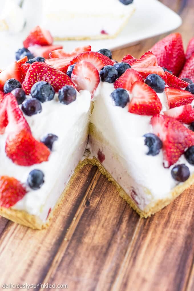 • Slice fresh strawberries and wash blueberries to place on top of the pie right before your ready to serve.