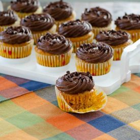 Today’s pumpkin recipe if for pumpkin cupcakes that all begin with a cake mix, with some extra ingredients including pumpkin, buttermilk, and sour cream. These cupcakes are amazingly moist. Then they get topped with a delicious chocolate frosting that has a bit of lightness to it from some whipping cream. The final touch is a sprinkling of mini chocolate chips.