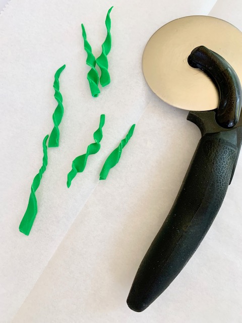 3. Roll out the fondant and with the pizza cutter cut into small strips. Twist the strips and let dry for a few hours until firm or overnight