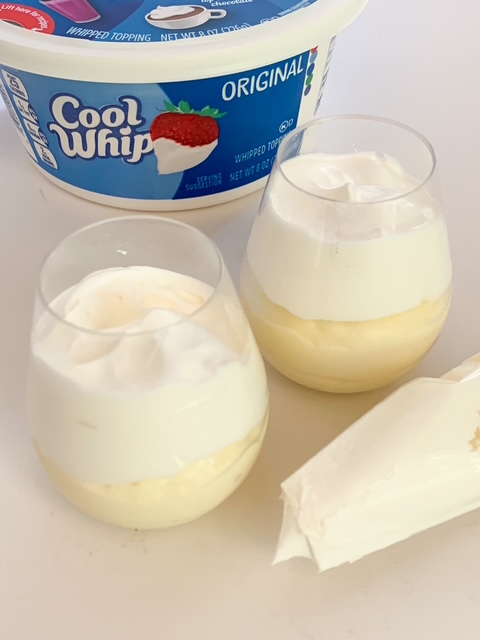 2. Then fill a piping bag with the Cool Whip and cut off the end. Pipe the Cool Whip evenly between the cups.