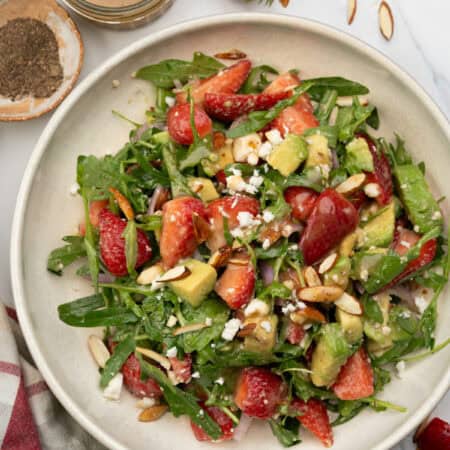 Toss together some juicy strawberries, avocado, arugula and red onion. Top it with toasted almonds and salty creamy feta. Drizzle with a sweet, tangy Maple Dijon dressing. You have just made yourself a tasty, crunchy and summery Strawberry Salad!