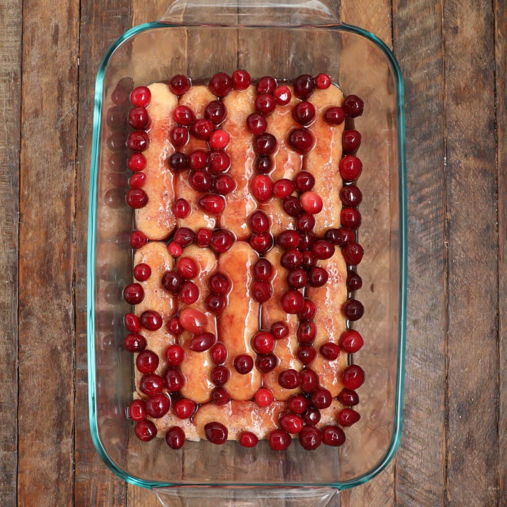 Spread half of the cooled cranberry mixture on top, followed by half of the cream mixture. Repeat layers with remaining ladyfingers, cranberry mixture, and cream.