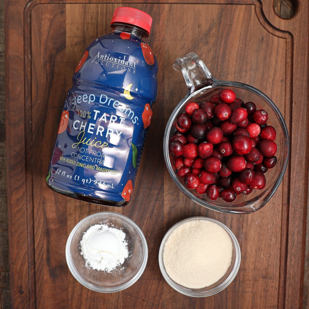 - Prepare the cranberry layer by cooking the cranberries with cherry juice, sugar, and cornstarch. Let it cool completely.