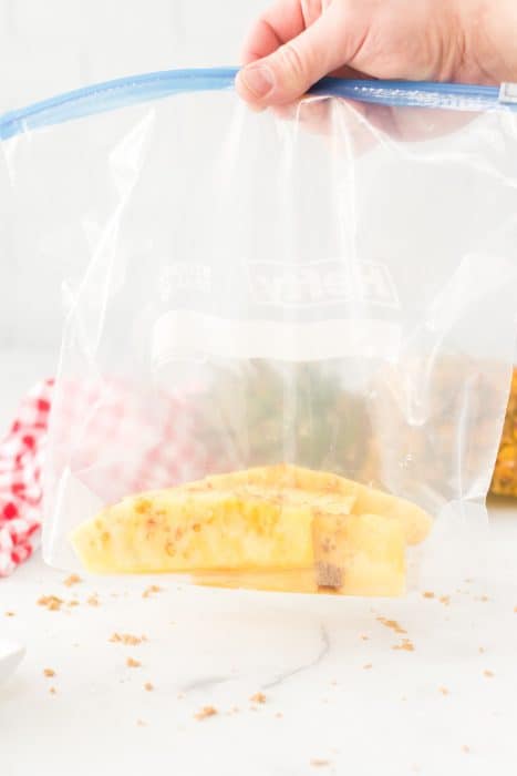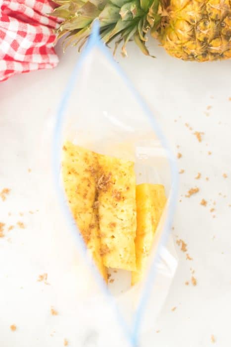 Once you’ve done all the that, it’s time to place the pieces of pineapple in a large zipper bag.