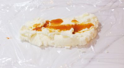 Using plastic wrap tear off a piece about 16 inches wide, and place the frosting in the center of the plastic wrap, spreading it out into a large rectangle.