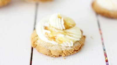 - Using plastic wrap tear off a piece about 16 inches wide and place the frosting in the center of the wrap, spreading it out into a large rectangle. Drizzle with the caramel sauce and roll the frosting up with the plastic wrap into one long ribbon of frosting. Twist the plastic wrap at the ends. Snip the end off of the plastic wrap, on one end only, and place it in a pastry bag with the large round tip. Pipe the Frosting onto the cookies, using a swirling motion, then bringing the frosting to a point at the top.