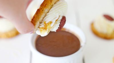 - Pour the Hershey’s Hard Shell Chocolate into a dish and dip the cookies into the chocolate, beginning with the first frosted cookie, and ending with the last frosted cookie.