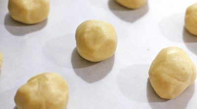 Line two cookie sheets with parchment paper, and roll the cookie dough into small balls, about 1 inch balls, and place the balls on the parchment paper.