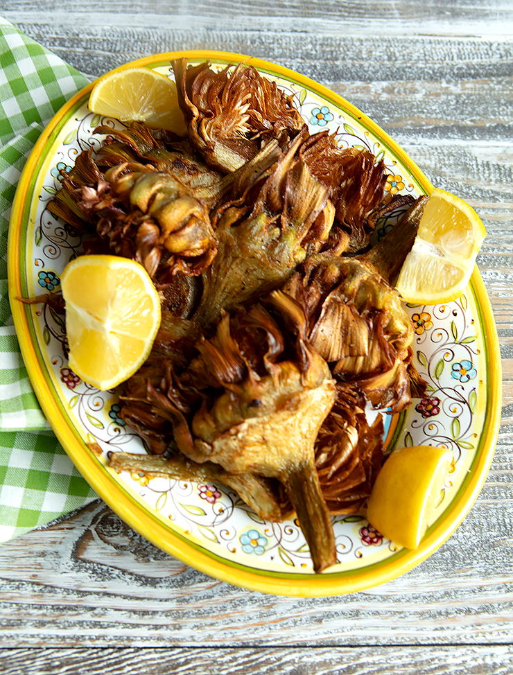 Although I love these fried chokes simply sprinkled with sea salt along with lemon wedges, they would also be great served with a lemon aioli dipping sauce. Because my chokes were on the larger size, I cut them in half so they would cook evenly, and it also makes them easier to clean out the fuzzy inner choke. These artichokes are best served immediately after cooking when they are very crisp.