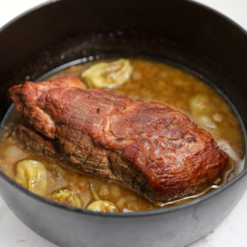 • Remove the pork roast from the Dutch oven and place it on a cutting board.
