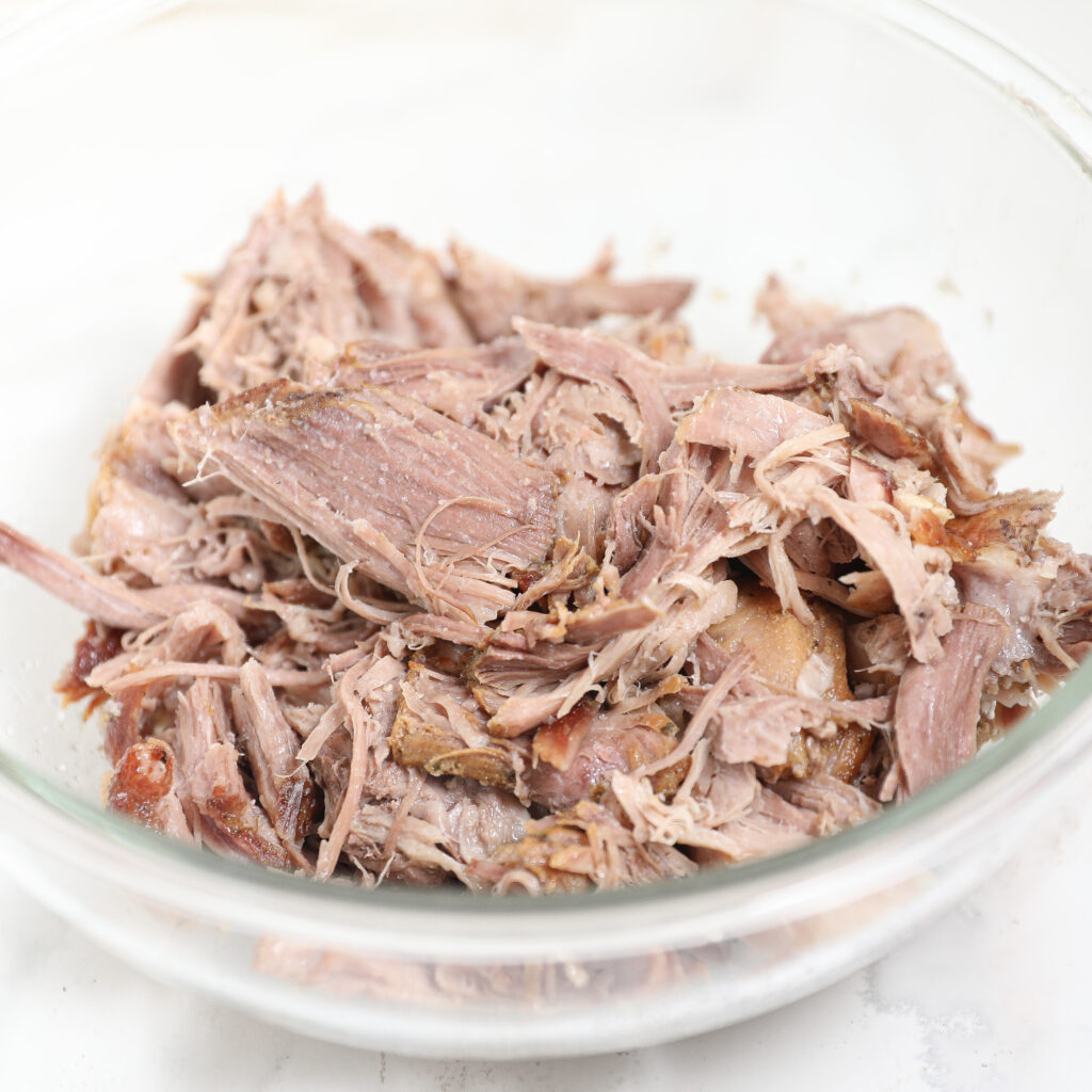 • Shred the meat using tongs or a fork and place it in a bowl.