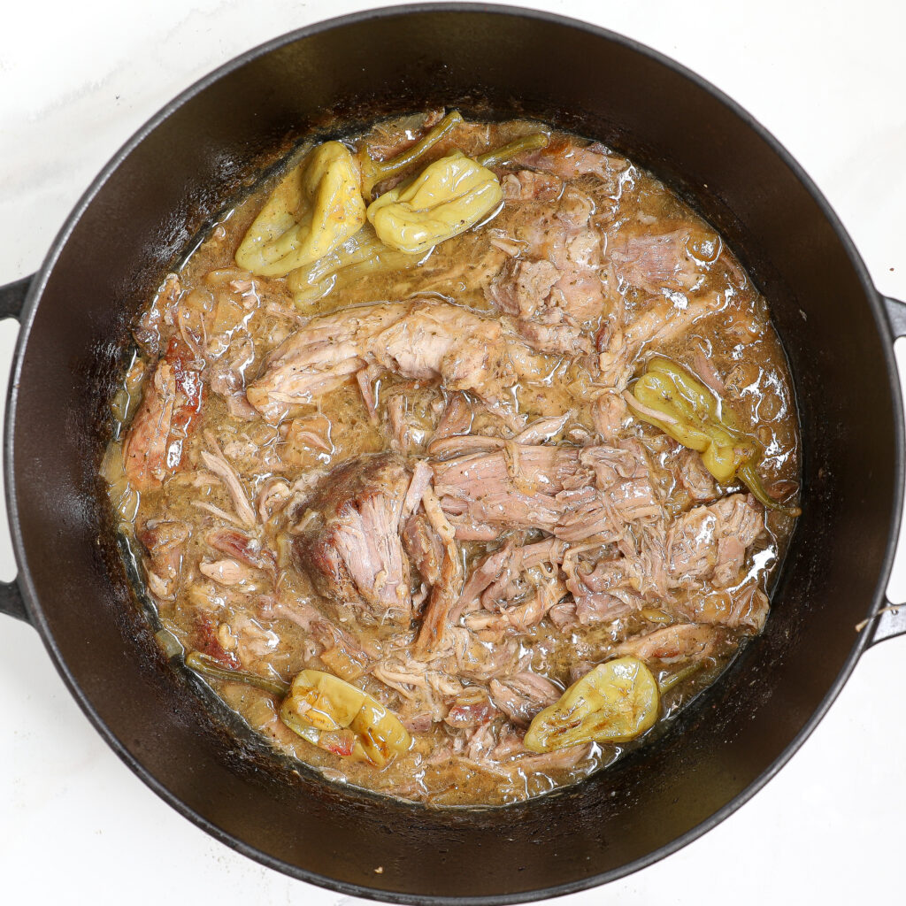 • Once the pork is done, remove it from the Dutch oven and set it aside.
