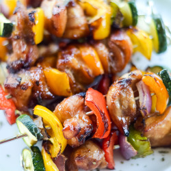 On each skewer stick build it with your choice of vegetables and rotate the chicken on the sticks.