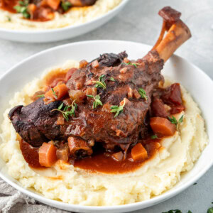 I love these braised red wine lamb shanks served over a bed of creamy mashed potatoes for the ultimate comfort meal.