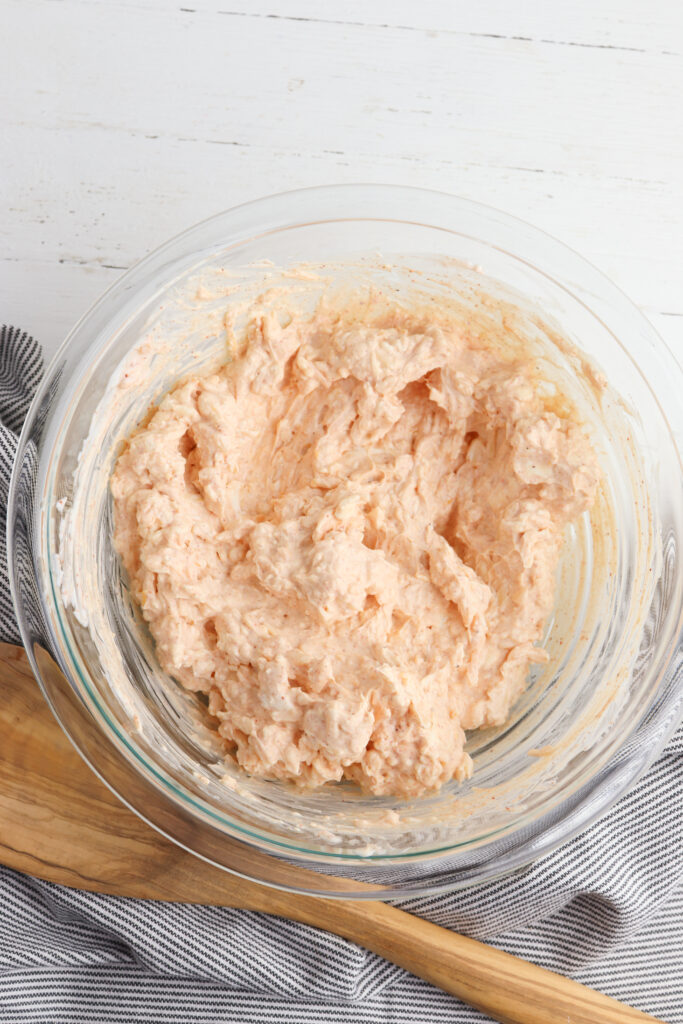 - Stir together the cream cheese, sour cream, shredded cheese, and taco seasoning until smooth and well combined.