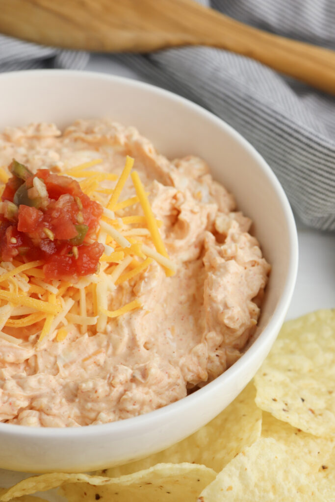 Absolutely! Cooked ground beef, ground turkey, or even shredded chicken can be layered on top of the dip for added flavor and protein. This transforms the dip into a hearty layer dip that pairs perfectly with tortilla chips. Just make sure your meat is precooked before it goes into the dip as the dip won’t be cooked.