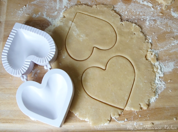 - In the meantime, roll the dough out and cut 2 heart shapes with the back of the mold.
