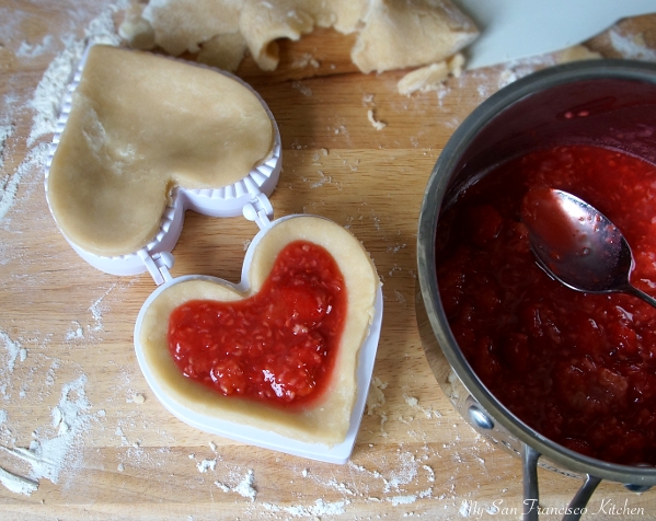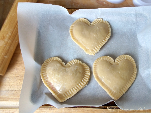 When I went to SoCal a few weeks ago to visit my family, my best friend Shannan gave me this super cute heart-shaped pocket pie mold. This was the perfect gift since Valentine’s Day is just around the corner! I tried it out the other day and made these delicious hand pies filled with fresh organic raspberries. It is not only for desserts, as you can also use it to make mini calzones and other pocket pies! These raspberry-filled hand pies have a flaky, buttery crust on the outside and a tart raspberry filling (you can control how sweet you want it by adding more or less sugar before you fill them). I used my flaky pie crust recipe for the crust, which worked great. I love Valentine’s Day, because it is another one of the holidays where you get to eat all of the chocolate and baked goods you want. Everything in moderation, right? These taste great with vanilla ice cream – yum!