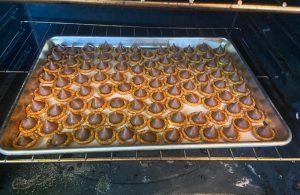 - Put them in the oven for at least 3 minutes. Test if they are ready by pushing an M&M in the middle of one of the Kisses. If it doesn’t go straight down as the Kiss collapses into itself, it’s not ready. There’s really no “baking time” for these, you just have to watch them.