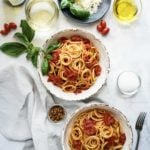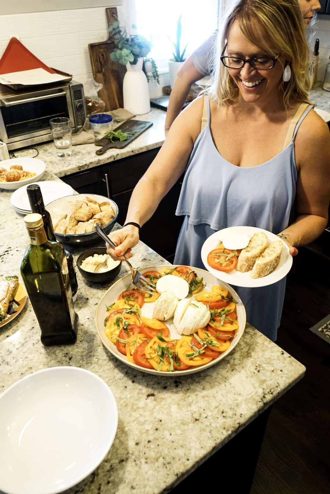 I prepared a classic heirloom tomato caprese salad, cut up some crusty italian bread and got the pasta cooking! Check out how simple it was to make below!