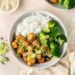 This easy teriyaki tofu is a delicious weeknight meal that takes just 15 minutes to make! Crispy, golden pieces of tofu are cooked with a sticky and savoury homemade teriyaki sauce that is packed with so much flavour, it’s better than anything store-bought. Serve it with rice and broccoli for an easy weeknight dinner that will satisfy that craving for takeaway.