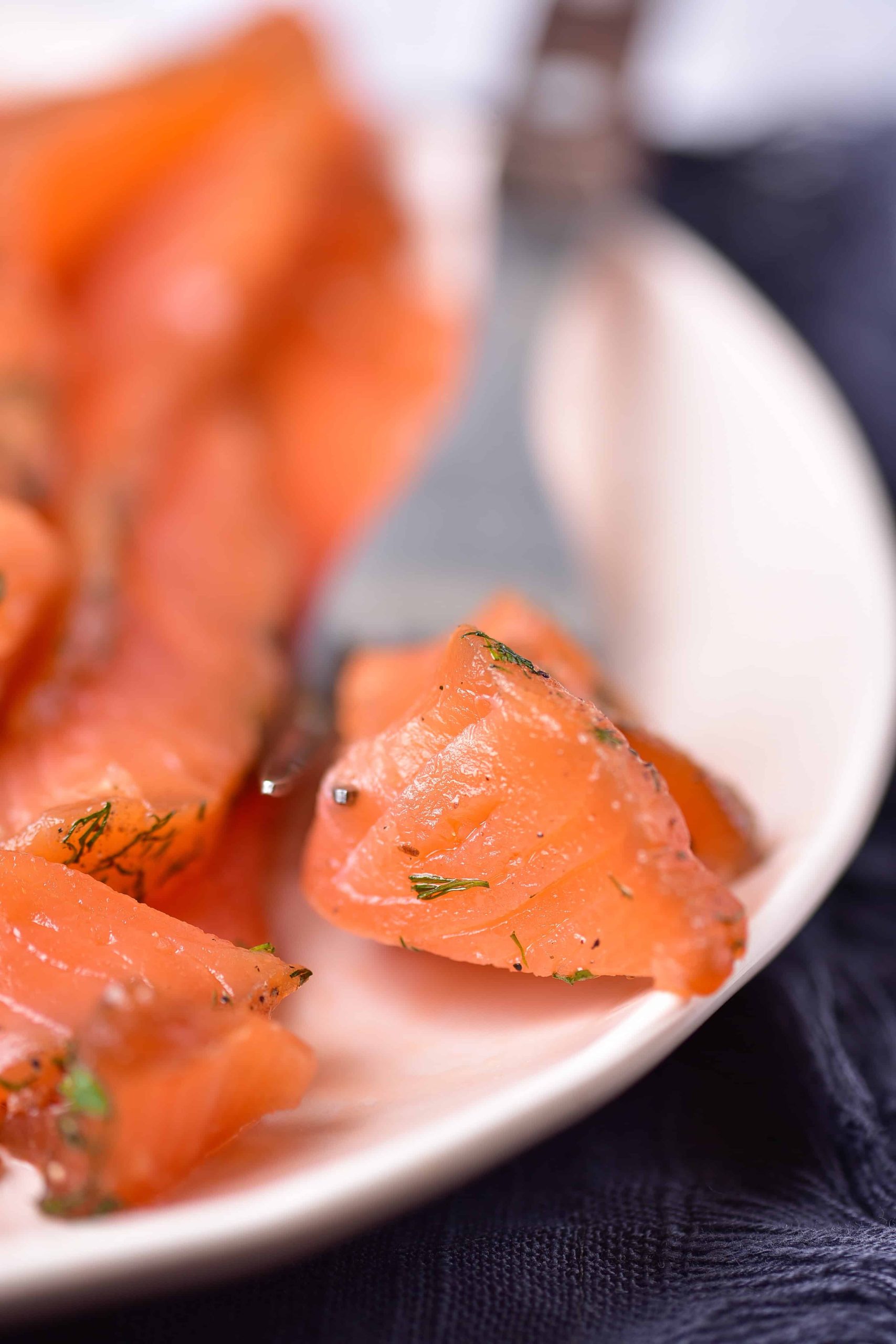 - Dill – Fresh dill seeps into the salmon as it cures, threading through each slice with its grassy brightness. Dried dill is an option, though it won’t be as vibrant. Either way, this herb is essential, it’s what makes gravlax taste like gravlax.