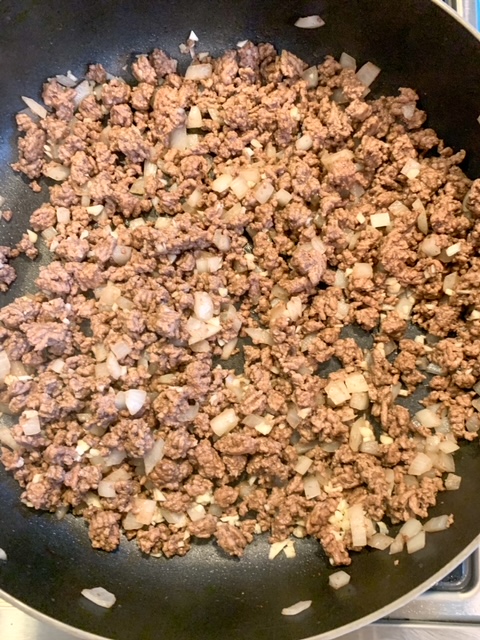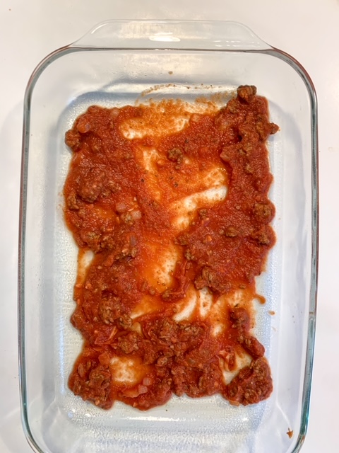 Next, sprinkle 1/2 of the cheese on top of the meat mixture.