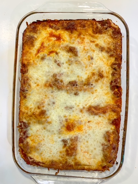 - Cover with foil and bake at 375 degrees F for ½ hour and remove the foil. Bake for 15 minutes more until the cheese on top is golden and bubbly.