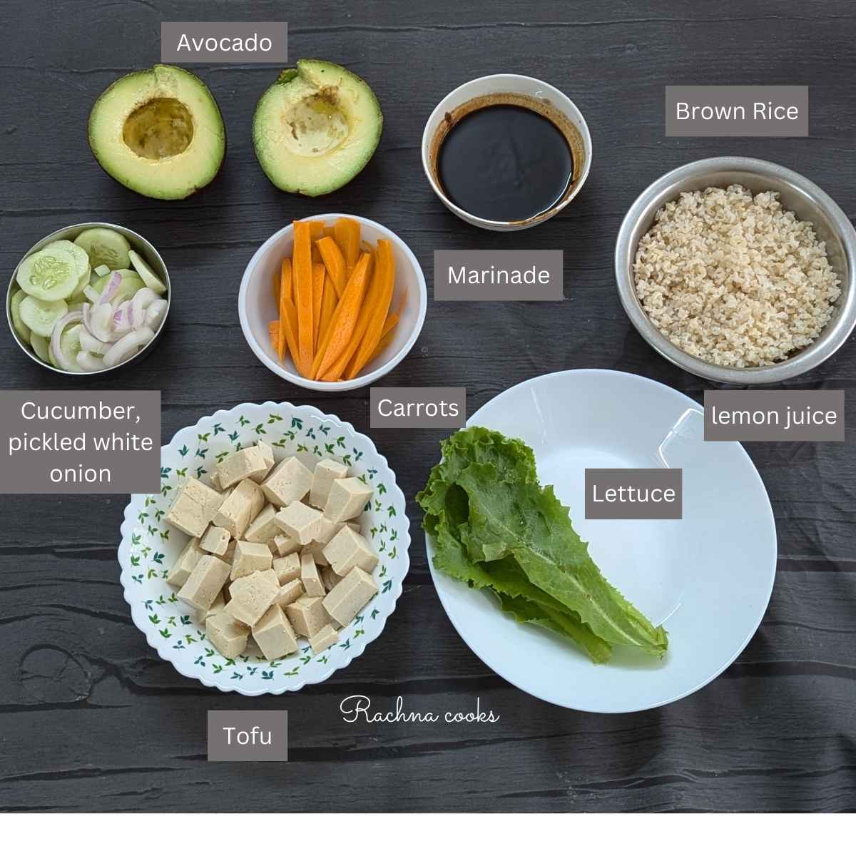 Vegetables: Any fresh vegetables that don’t need cooking work here. I have used some fresh lettuce, sliced cucumber, avocado and carrot. You can use edamame beans if you have them. Radishes and peppers are taste good.
