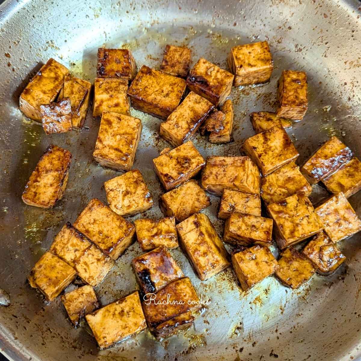 Use firm tofu and press it well between paper towels to squeeze out all moisture. Cut into cubes and marinate with the sauce for about 15 minutes till it absorbs flavour.