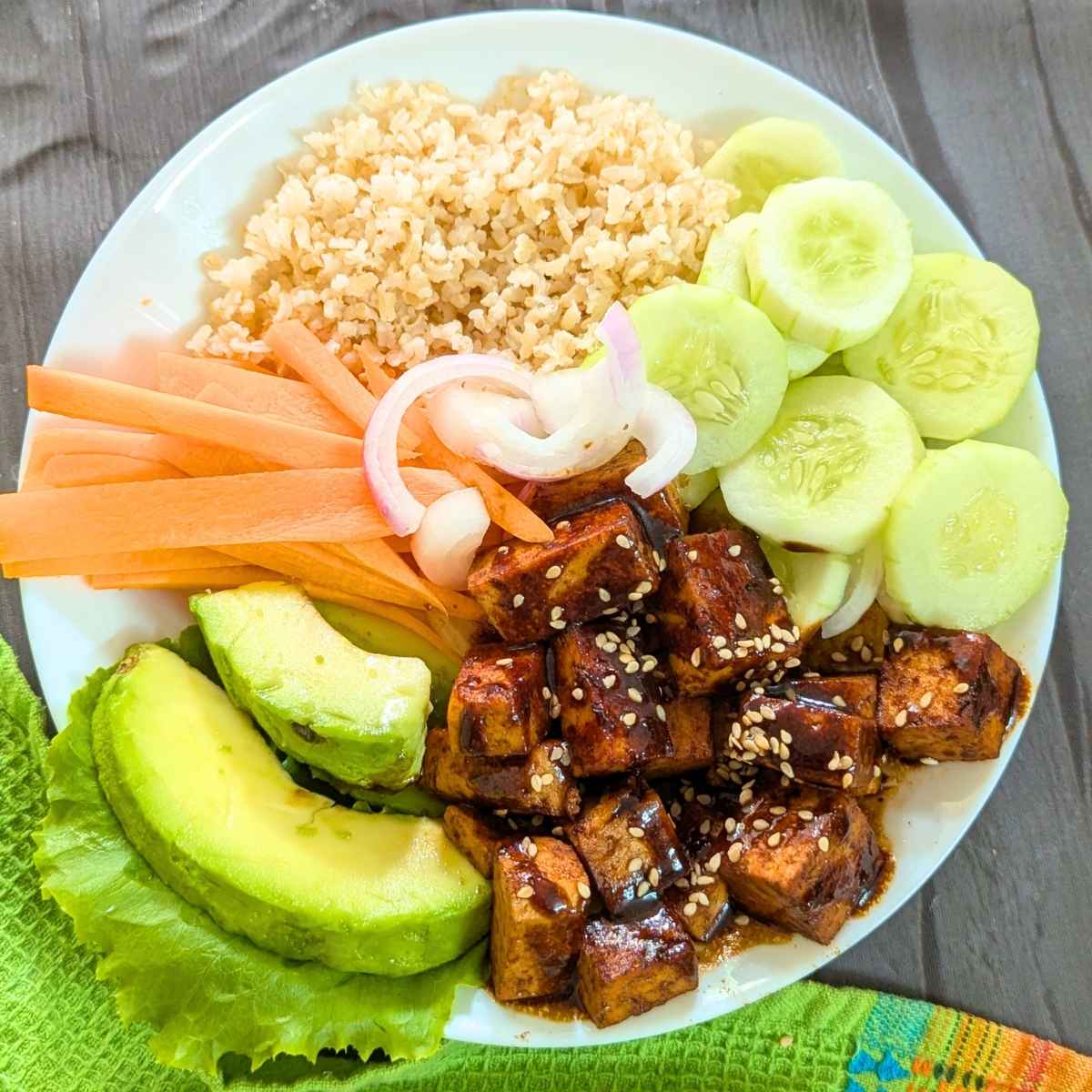 Now assemble you bowl by adding the cooked rice, layering the veggies and avocado along with crispy tofu. Spoon the sauce all over the tofu cubes. Top with toasted sesame seeds, pickled onion and ginger and serve lemon wedges on the side.
