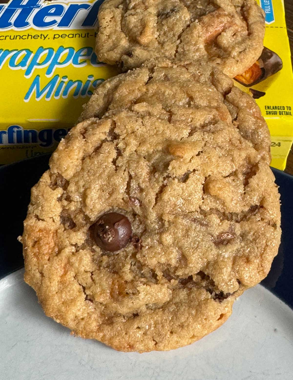 Any Butterfinger bars would work. I used two movie theatre size boxes of Butterfinger Minis, which I just sliced with a chef’s knife. I tried to leave some big chunks in the cookies so that the candy would be detectable and not just dissolve right in. It was definitely detectable.